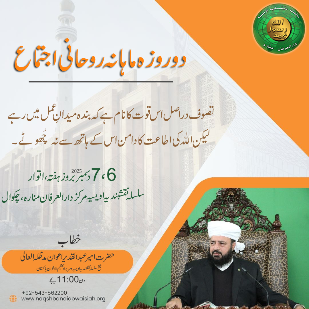 Mahana Ijtima Dar Ul Irfan Munarah by Sheikh-e-Silsila Naqshbandia Owaisiah Hazrat Ameer Abdul Qadeer Awan (MZA) - Announcements on December 6,2025