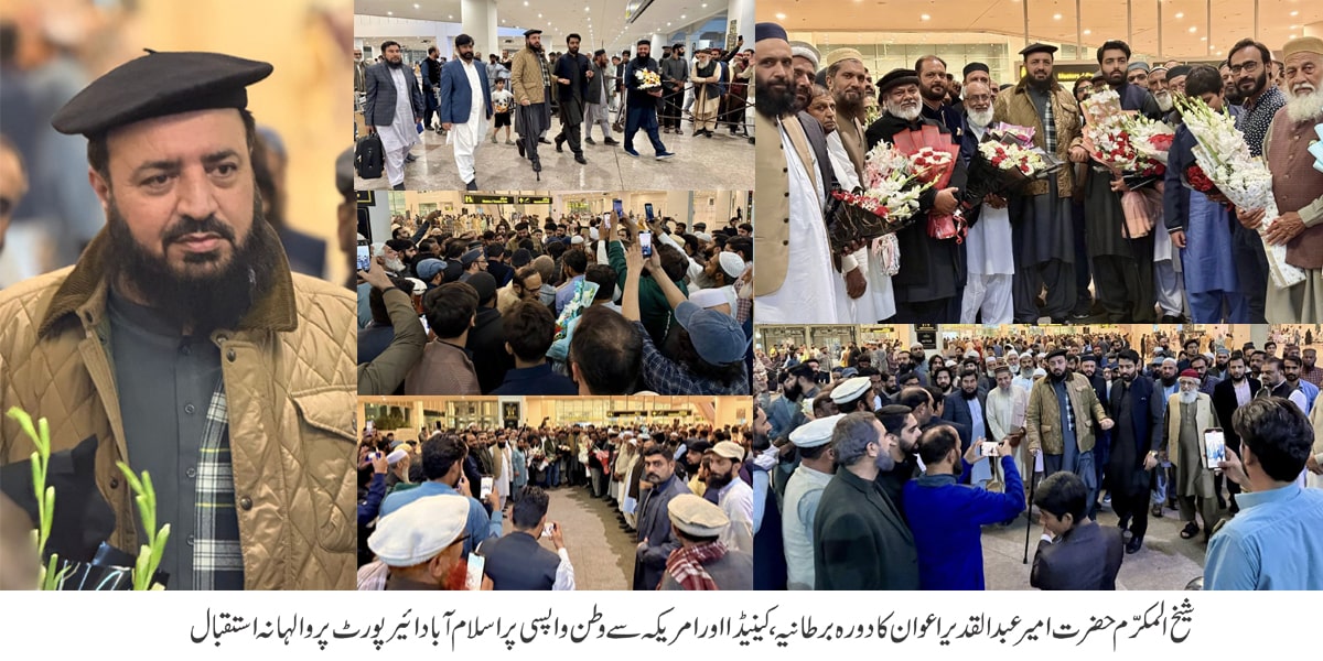 اسلام آباد انٹرنیشنل ایئرپورٹ پر ان کا فقیدالمثال استقبال کیا گیا۔ اس موقع پر راولپنڈی، اسلام آباد اور پشاور ڈویژن کے ذمہ داران، صاحبِ مجازین، سالکینِ سلسلہ نقشبندیہ اویسیہ، عقیدت مندوں، دوستوں اور احباب کی ایک بڑی تعداد موجود تھی جنہوں نے اپنے محبوب شیخ المکرم کا پُرجوش انداز میں خیرمقدم کیا۔
